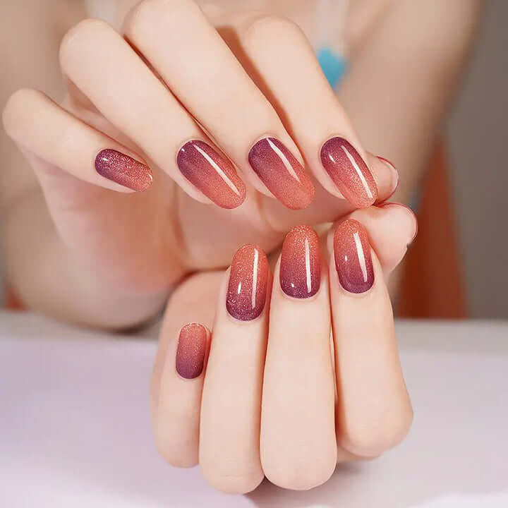Moon Beam es una manicura de gel inspirada en la magia de un atardecer espacial. Combina un vibrante coral con un malva profundo, creando un impresionante efecto degradado (Ombré) realzado por un brillo magnético que se mueve con la luz.