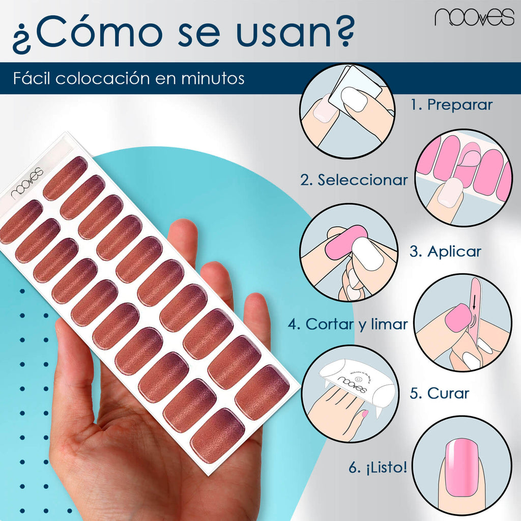 Es más sencillo de lo que imaginas. Solo tienes que limpiar tu uña con el pad incluido, elegir la lámina que mejor se adapte, colocarla con cuidado y curar durante 60 segundos con tu lámpara UV/LED. En minutos, tendrás una manicura de gel en casa impecable, sin esperas ni secado.